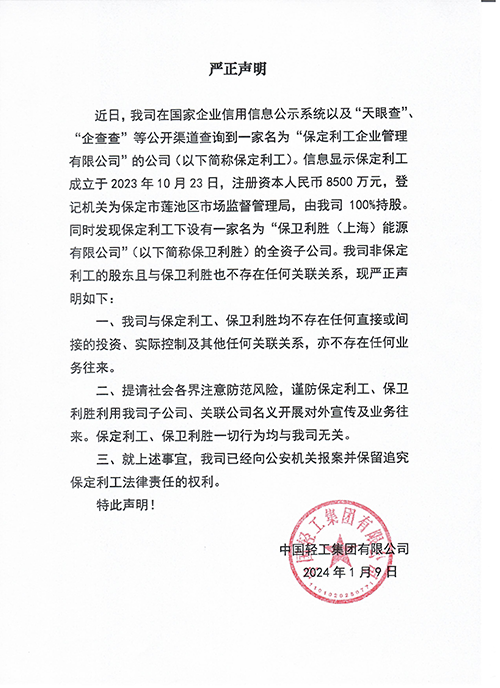 近日,我司在國(guó)家企業(yè)信用信息公示系統(tǒng)以及“天眼查”、“企查查”等公開渠道查詢到一家名為“保定利工企業(yè)管理有限公司”的公司(以下簡(jiǎn)稱保定利工)。信息顯示保定利工成立于2023年10月23日,注冊(cè)資本人民幣8500萬(wàn)元,登記機(jī)關(guān)為保定市蓮池區(qū)市場(chǎng)監(jiān)督管理局,由我司100%持股。同時(shí)發(fā)現(xiàn)保定利工下設(shè)有一家名為“保衛(wèi)利勝(上海)能源有限公司”(以下簡(jiǎn)稱保衛(wèi)利勝)的全資子公司。我司非保定利工的股東且與保衛(wèi)利勝也不存在任何關(guān)聯(lián)關(guān)系,現(xiàn)嚴(yán)正聲明如下: